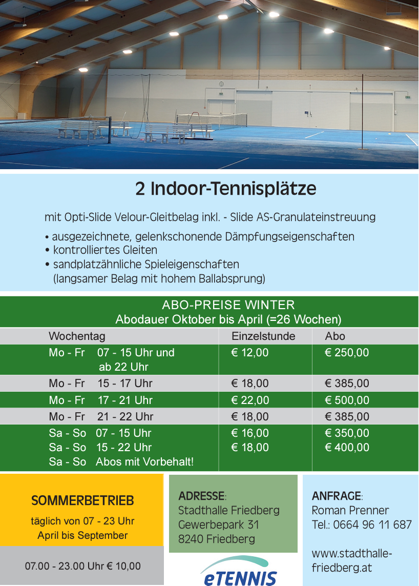 Sportzentrum mit Fußballplatz, Trainingsplatz,+ 3 Tennisplätze im Freien, 2 Hallenplätze und Funpark